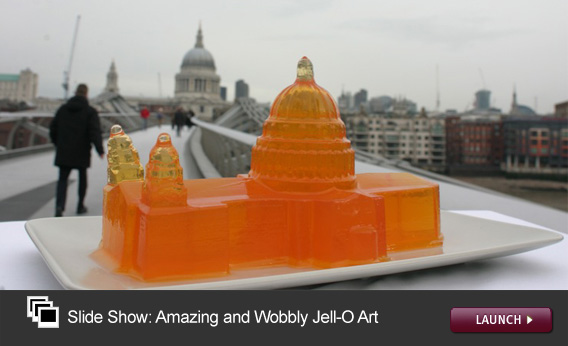 In their book, Jellymongers, which is just out in the U.S., Bompas and Parr chronicle art-meets-food events like this one, share their vast jelly knowledge, and offer photographs of cheerfully colored jellies molded into the shapes of buildings like St. Paul's Cathedral and the Taj Mahal. There are also surprisingly doable recipes calling for fresh or bottled fruit juices and, occasionally, liquor. The trickiest part about making them is finding sheets of gelatin. "The powdered kind really is rubbish," Parr says.